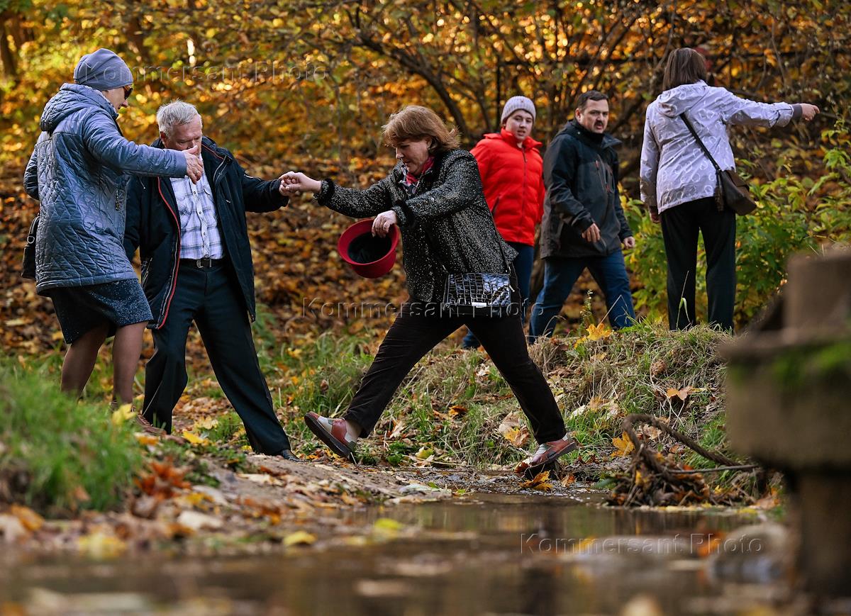 Views of Moscow. Autumn in Kolomensky park. Genre photography. Visitors to the Kolomenskoye Museum-Reserve during a walk in the park.