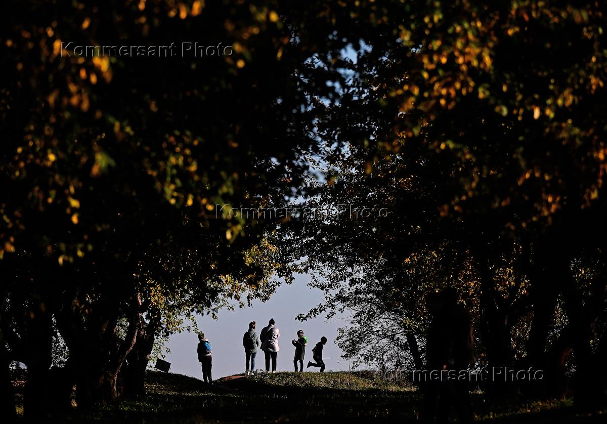 Views of Moscow. Autumn in Kolomensky park. Genre photography. Visitors to the Kolomenskoye Museum-Reserve during a walk in the park.