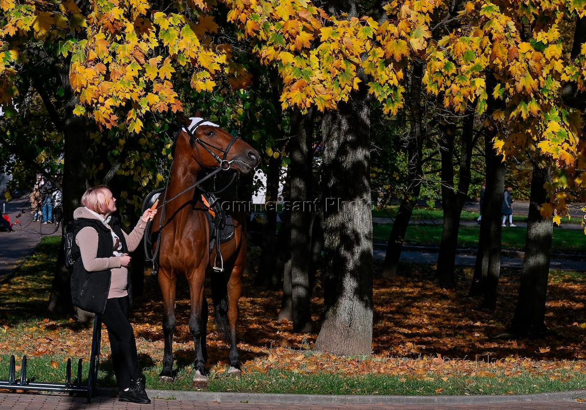 Views of Moscow. Autumn in Kolomensky park. Genre photography. An employee of the equestrian club offers horseback riding.