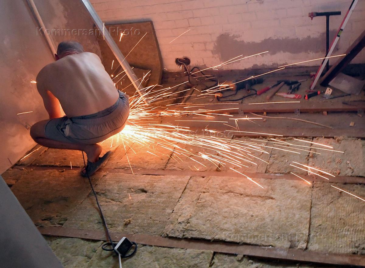 Repair in an apartment building. Genre photos. Worker during repair work in the apartment.