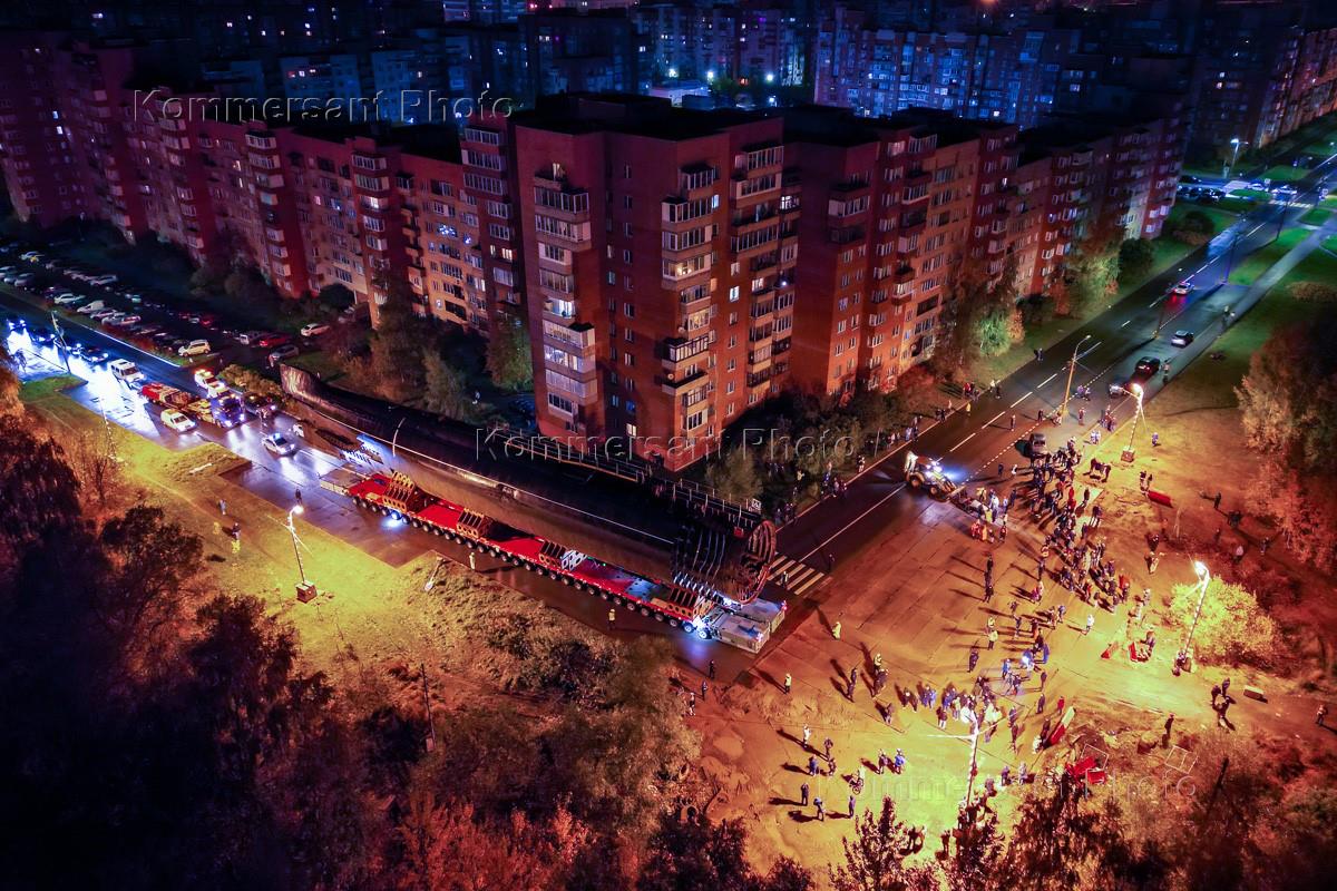 Land movement of the stern of the K-3 submarine along the streets of Kronstadt to the building of the Museum of Naval Glory.