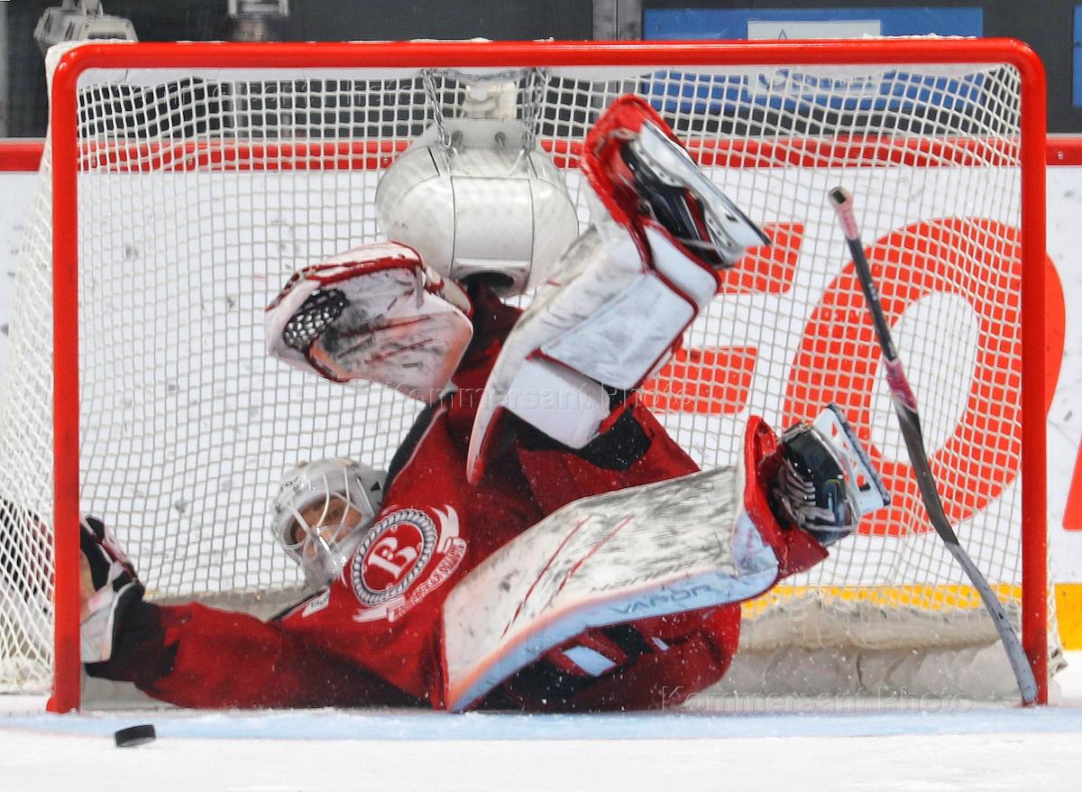 Kontinental Hockey League (KHL). Match between the teams "Vityaz" (Podolsk) and "Spartak" (Moscow) at the Arena Balashikha stadium named after Yuri Lyapkin. Vityaz team goalkeeper Maxim Dorozhko (left) during the match.