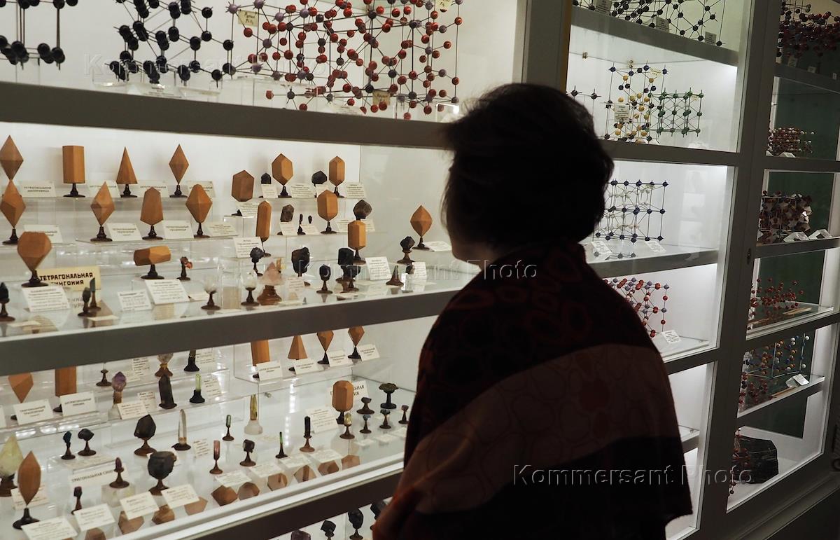 Mining Museum of St. Petersburg Mining University. Genre photography. A museum visitor at the cabinet with minerals during the excursion.