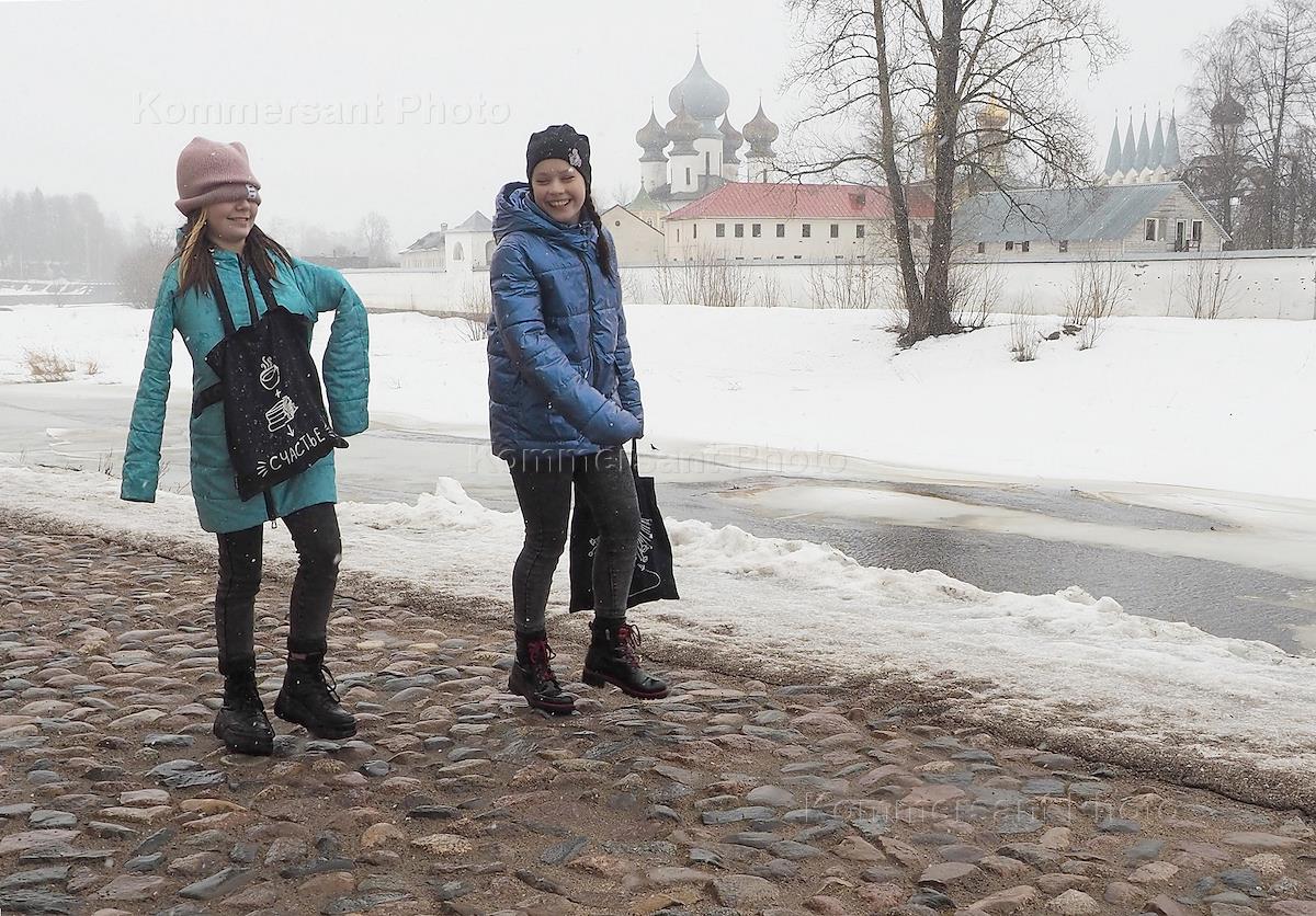 Виды Тихвина. Жанровая фотография. Девочки идут по берегу реки Тихвинки зимой.