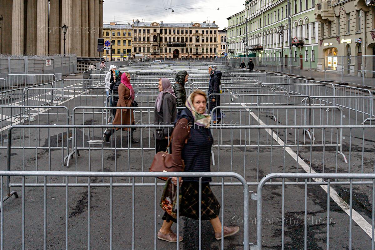 Genre photography. Believers in front of the Kazan Cathedral in line for the ark with the relics of St. Sergiy Radonezhskiy.