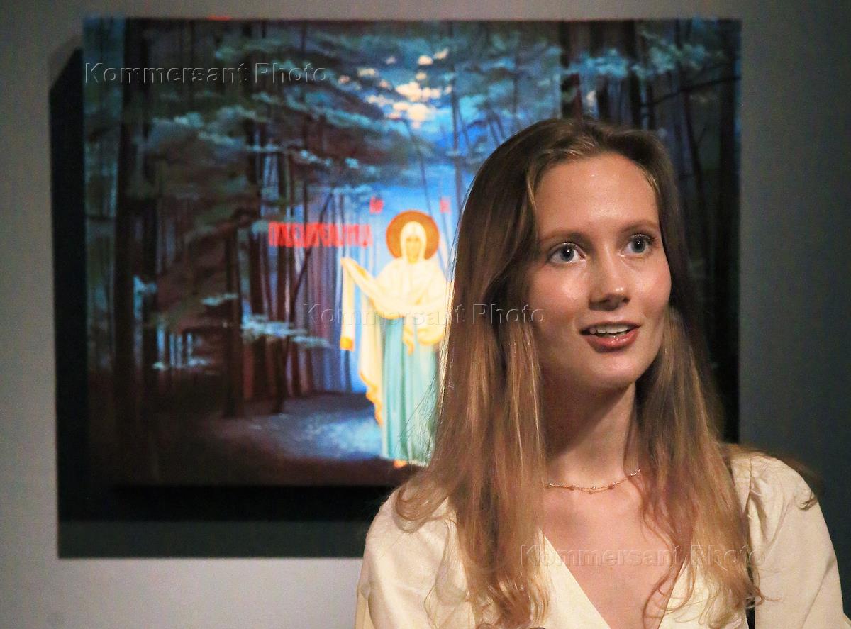 The opening ceremony of the art exhibition of contemporary Christian art "Faces of Mary - Images of Light" by artist Veronika Ponomareva-Korzhevskaya at the Art Center Moscow gallery on Volkhonka. Artist Veronika Ponomareva-Korzhevskaya during the ceremony.