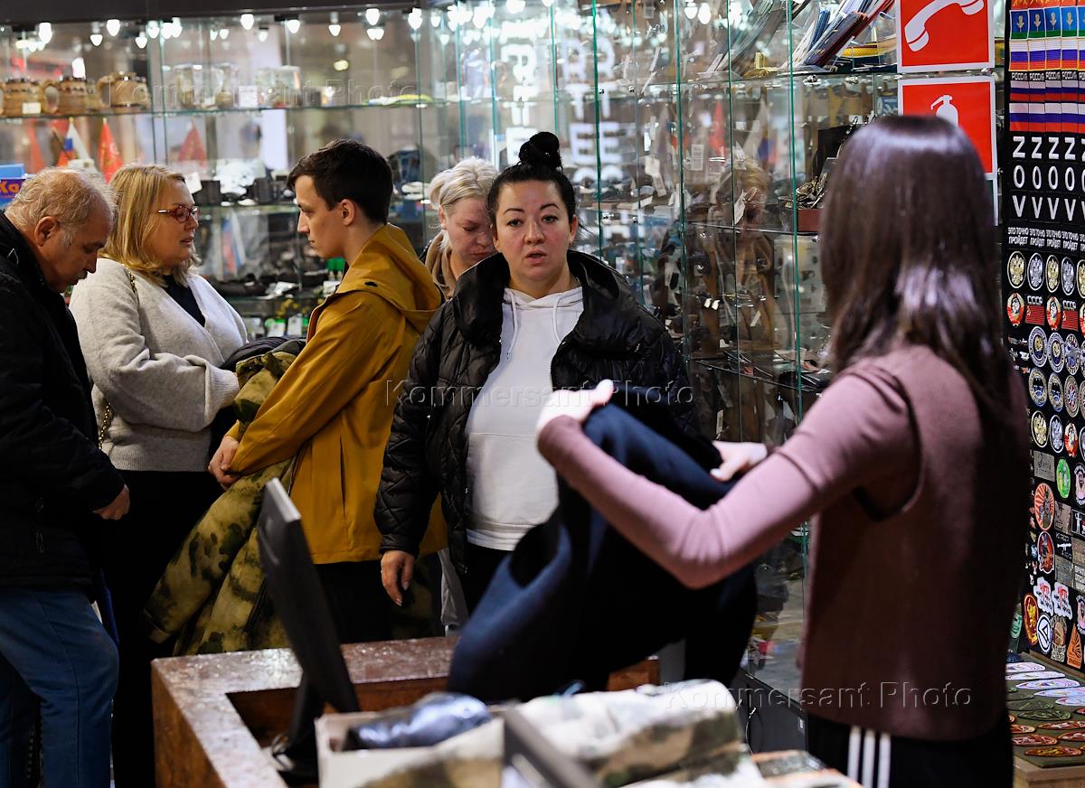 The work of the military equipment store "PROFARMY". Genre photography. Buyers in the store.