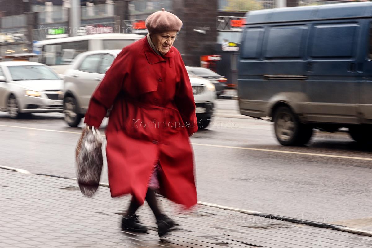 Views of Tula. Genre photography. An elderly woman walks along the sidewalk along the roadway.
