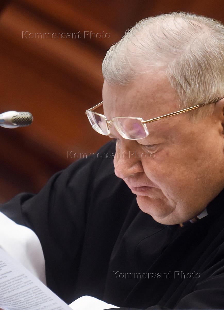 An open session of the Constitutional Court of Russia to consider a case on checking the constitutionality of paragraph 37 of the Rules for the collection, calculation, payment and collection of a recycling fee in relation to self-propelled vehicles and (or) trailers for them, as well as the return and offset of overpaid or overcharged amounts of this fee. Judge Sergei Knyazev during the meeting.