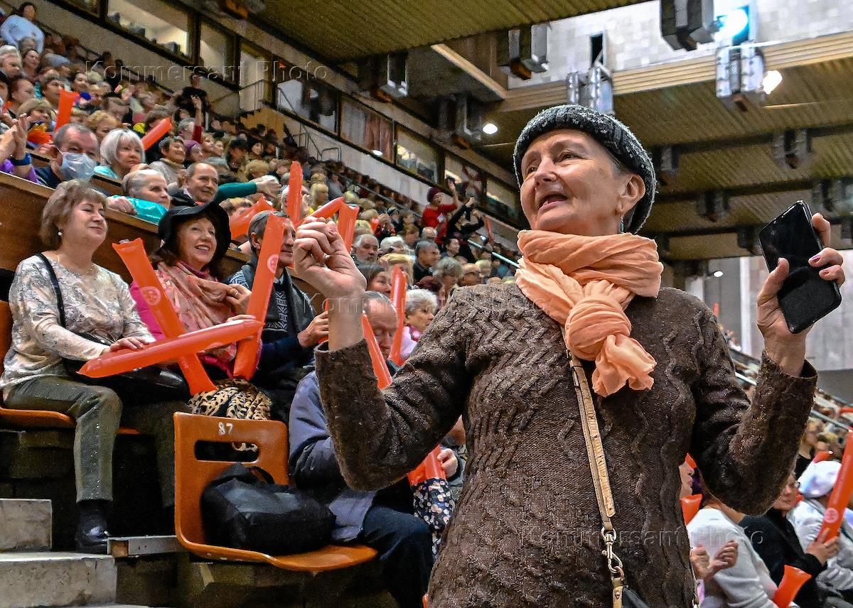 Товарищеский матч между командой Московского долголетия и командой звезд эстрады "Старко" на стадионе ЦСКА. Жанровая фотография. Болельщики на трибуне.