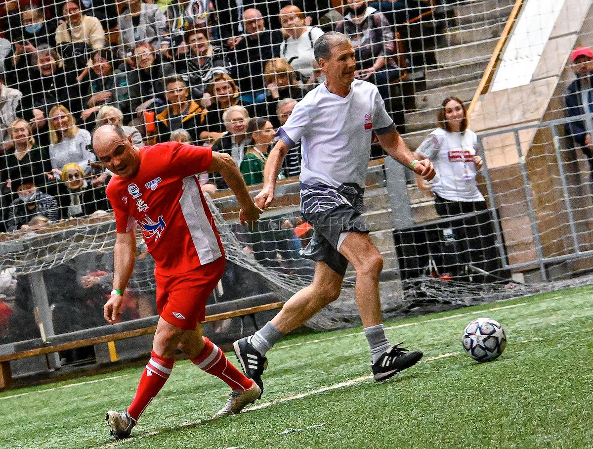 Товарищеский матч между командой Московского долголетия и командой звезд эстрады "Старко" на стадионе ЦСКА. Певец Валерий Сюткин (слева) во время матча.