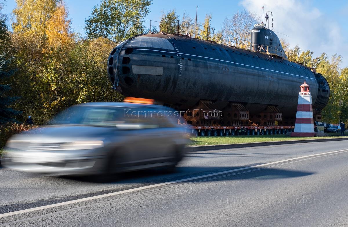 Сухопутное перемещение носовой части подводной лодки К-3 по улицам Кронштадта к зданию Музея военно-морской славы.
