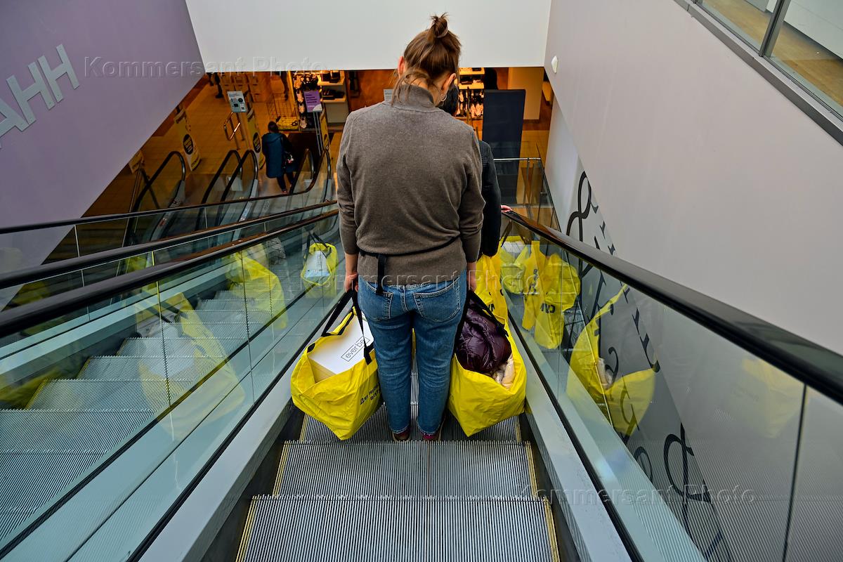 Action "Crazy days" in the store "Stockmann" in the shopping mall "Mega Belaya Dacha". Genre photography. Buyer with purchases on the escalator.