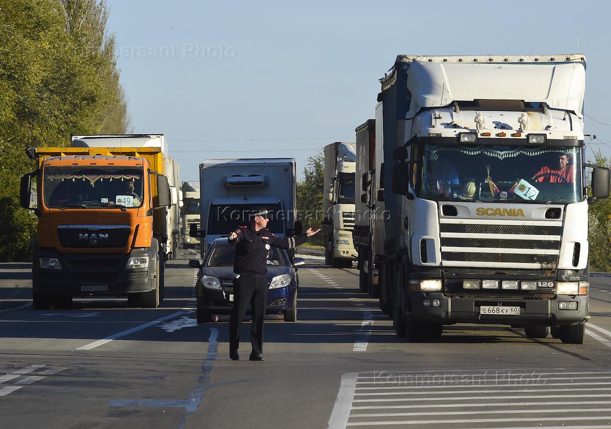 A column of heavy vehicles, formed on the territory of Kerch, while moving along a new land route, accompanied by the traffic police.