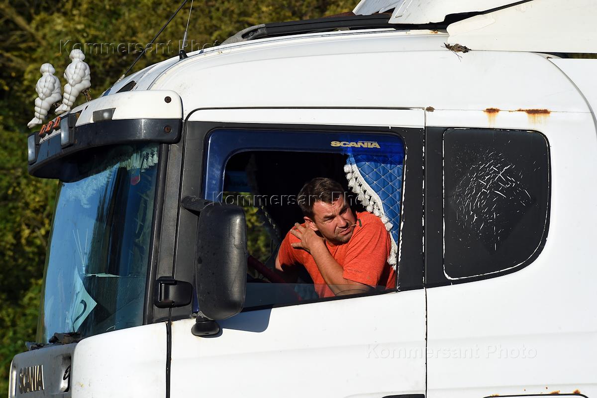 A column of heavy vehicles, formed on the territory of Kerch, while moving along a new land route, accompanied by the traffic police. Genre photography. The driver while refueling the car.