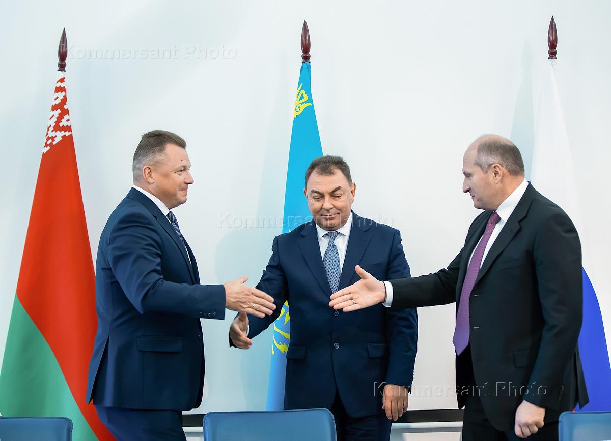 The ninth meeting of the joint board of the EMERCOM of Russia, Belarus and Kazakhstan. From left to right: Minister of Emergencies of Belarus Vadim Sinyavsky, Minister of Emergencies of Kazakhstan Yury Ilyin and Minister of Emergencies of Russia Alexander Kurenkov during the meeting.
