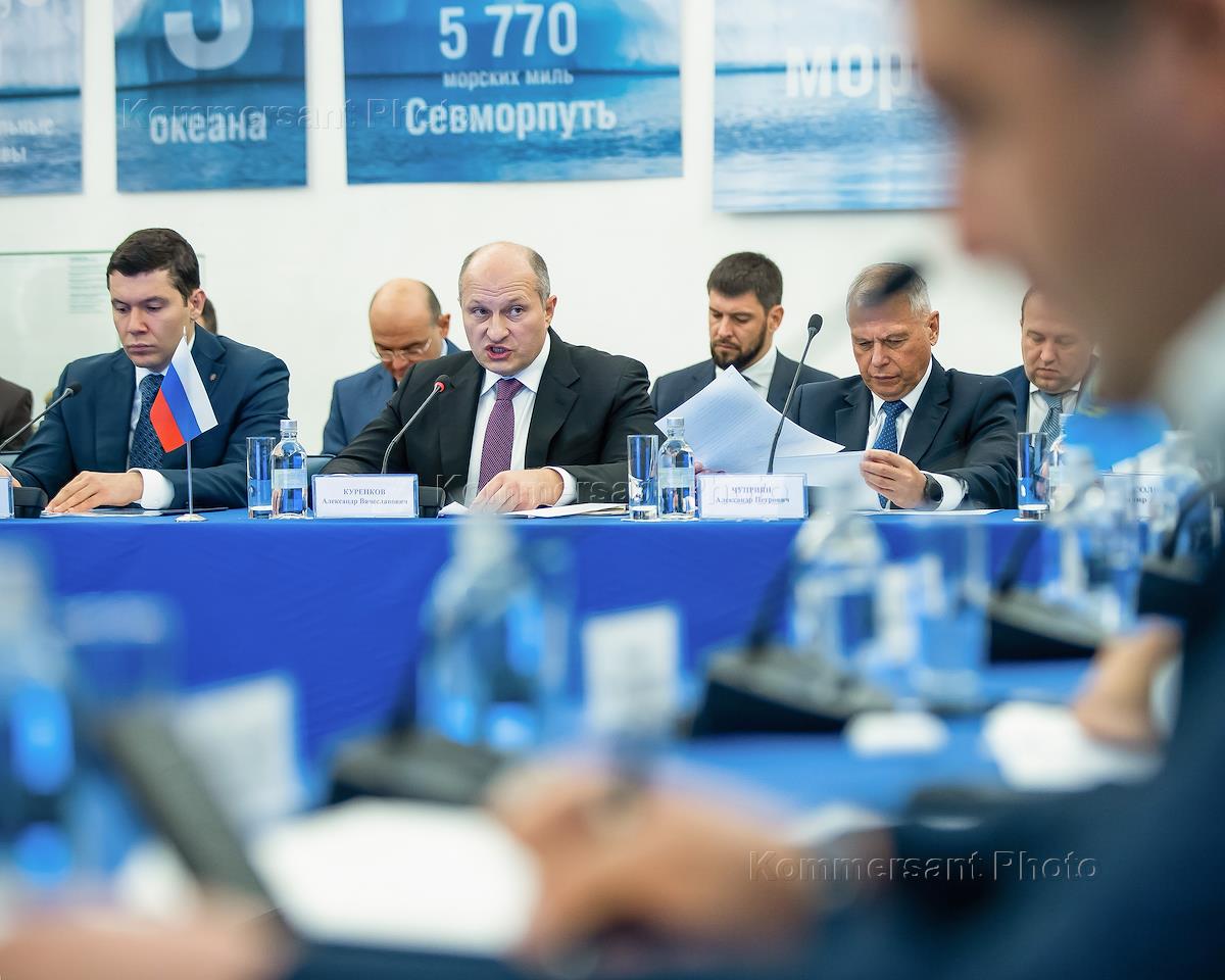 The ninth meeting of the joint board of the EMERCOM of Russia, Belarus and Kazakhstan. Governor of the Kaliningrad Region Anton Alikhanov (left) and Minister of the Russian Emergencies Ministry Alexander Kurenkov (center) during the meeting.
