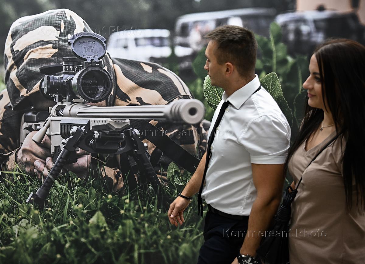 International exhibition of weapons and goods for hunting "Orёlexpo 2022" in Gostiny Dvor. A visitor inspecting weapons from the Novosibirsk Instrument-Making Plant at an exhibition.