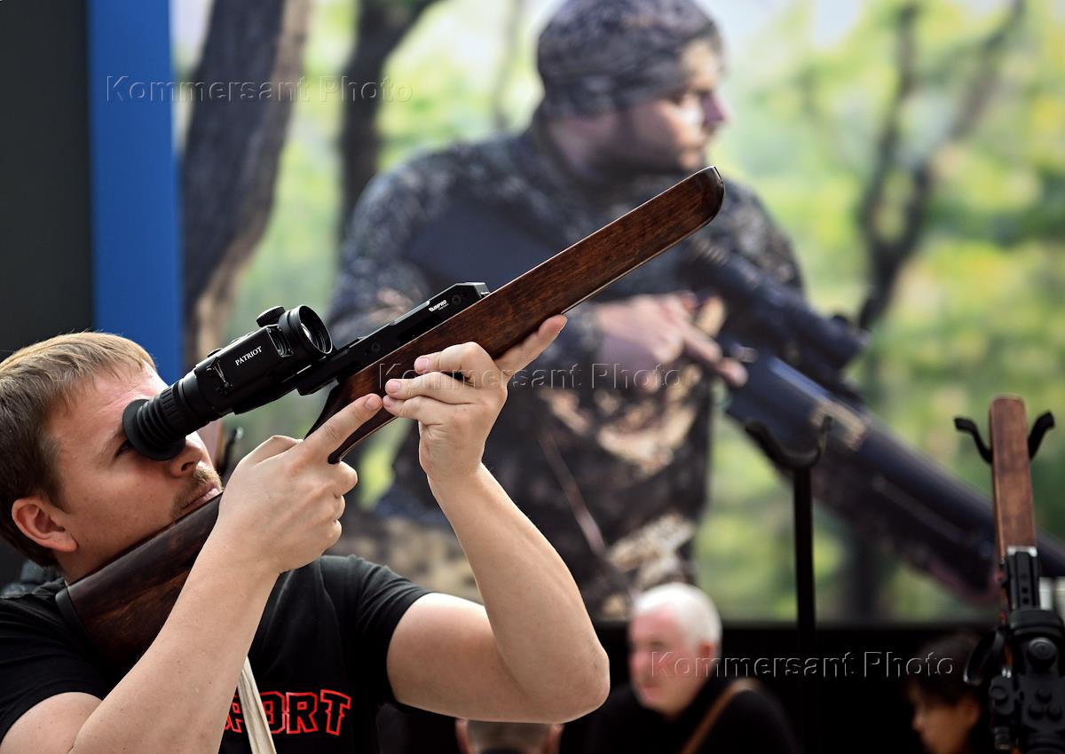 International exhibition of weapons and goods for hunting "Orёlexpo 2022" in Gostiny Dvor. A visitor inspecting weapons from the Novosibirsk Instrument-Making Plant at an exhibition.
