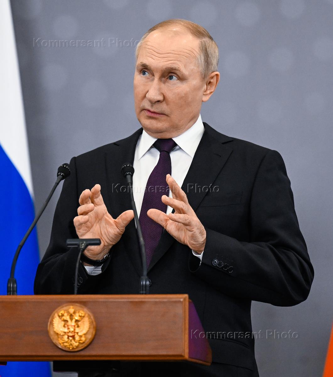 Рабочая поездка президента России Владимира Путина в Астану. Президент России Владимир Путин во время подхода к прессе по итогам заседания глав государств - участников Содружества Независимых Государств.