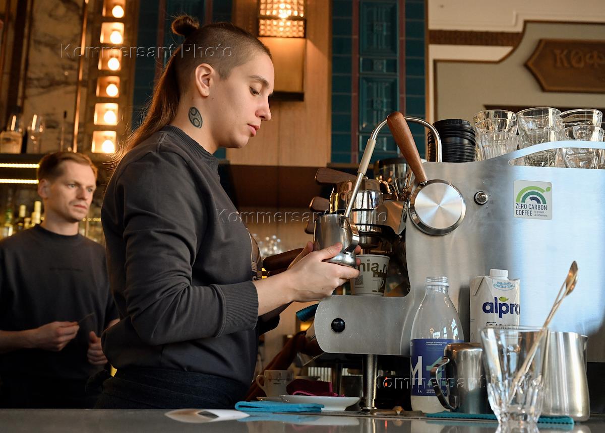 Работа кофейни "Кофемания" у станции метро "Лубянка". Жанровая фотография. Бариста во время приготовления кофе.