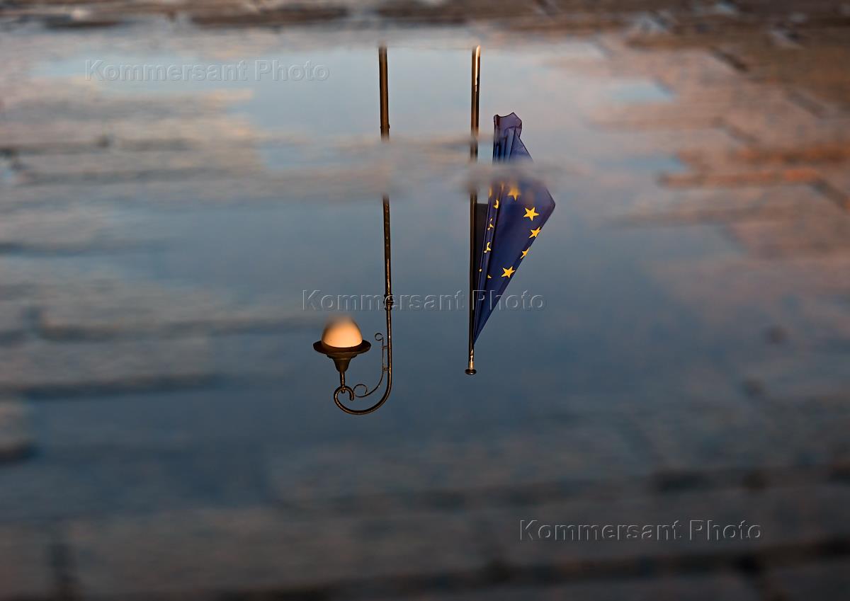 Виды Москвы. Жанровая фотография. Отражение фонаря и флага Европы в луже.