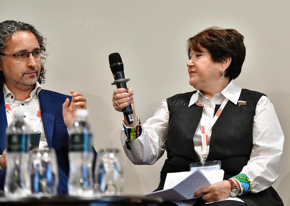 III ежегодный деловой форум "Женщины в агробизнесе" в гостинице "Метрополь". Представитель в Совете Федерации от законодательного (представительного) органа государственной власти Приморского края Людмила Талабаева (справа) и управляющий партнер Agrotrend.ru Николай Лычев (слева) на форуме.