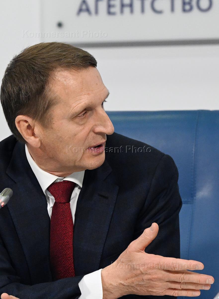 Пресс-конференция по итогам IV Международной просветительской акции "Диктант Победы – 2022" в информационном агентстве ТАСС. Председатель Российского исторического общества (РИО), руководитель Службы внешней разведки России Сергей Нарышкин во время пресс-конференции.
