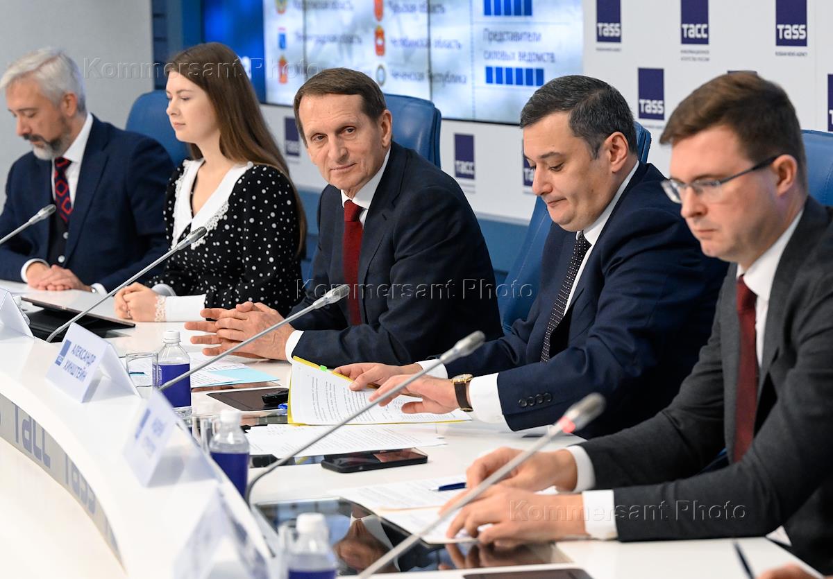 Press conference on the results of the IV International educational campaign "Dictation of Victory - 2022" at the TASS news agency. Chairman of the Russian Historical Society, head of the Russian Foreign Intelligence Service Sergei Naryshkin during the press conference.