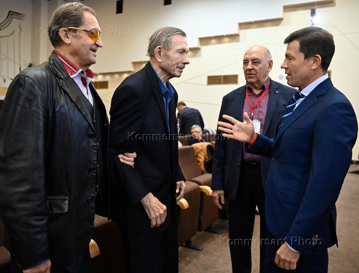 Extraordinary reporting and election conference of the Russian Biathlon Union (RBU) in the building of the Russian Olympic Committee. President of the RBU Viktor Maigurov (right), Honorary Vice President of the RBU Viktor Mamatov (second from left) and Advisor to the President of the RBU Vladimir Barnashov (second from right) before the conference.