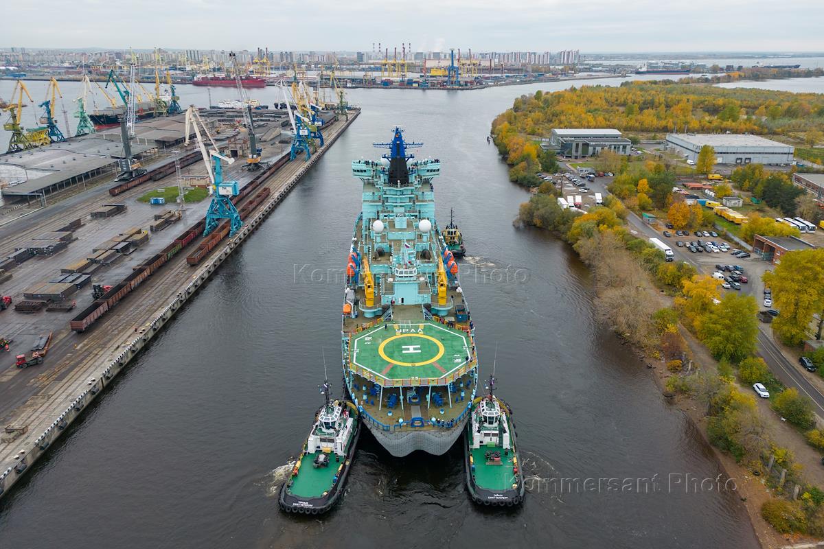 Атомный ледокол "Урал" в акватории Большого порта Санкт-Петербурга во время выхода на ходовые испытания.