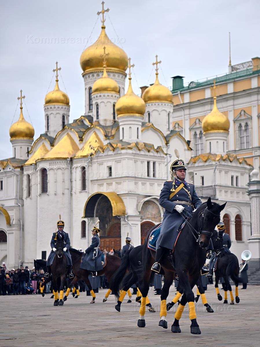 Ceremony of disengagement of foot and horse guards of the Presidential Regiment of the Commandant's Service of the Moscow Kremlin of the Federal Guard Service of Russia on the Cathedral Square of the Moscow Kremlin. Soldiers of the Presidential Regiment during the ceremony.