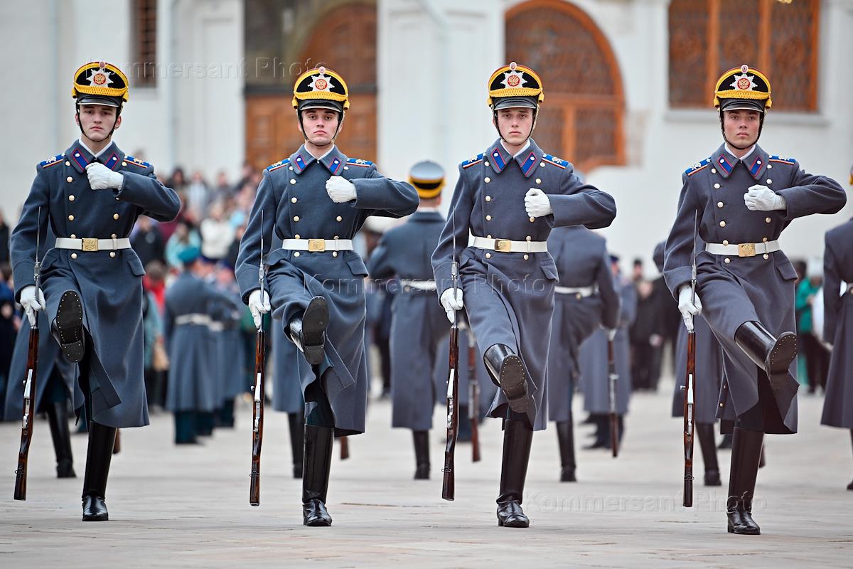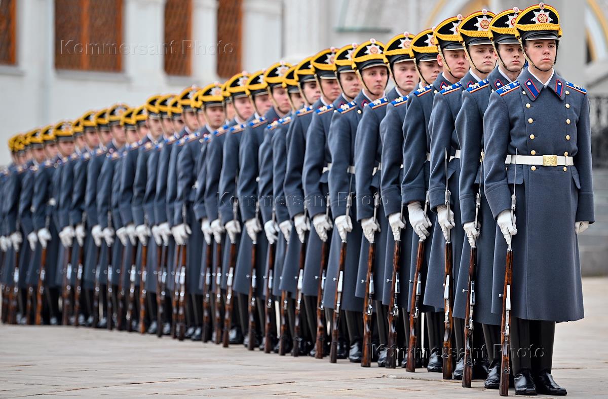 Церемония развода пеших и конных караулов Президентского полка Службы коменданта Московского Кремля Федеральной службы охраны (СКМК ФСО) России на Соборной площади Московского Кремля. Военнослужащие Президентского полка во время церемонии.