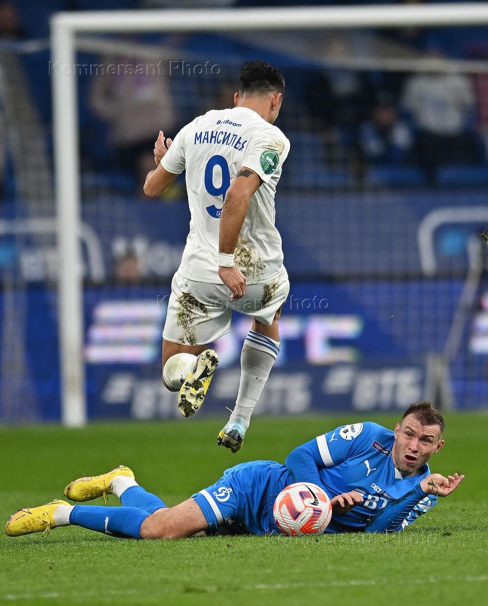 Russian Premier League (RPL). MIR - Russian Football Championship 2022/2023. 13th round. Match between the teams "Dynamo" (Moscow) - "Orenburg" (Orenburg) at the stadium "VTB Arena". Orenburg team player Brian Mansilla (left) and Dynamo team player Sergei Parshivlyuk (right) during the match.