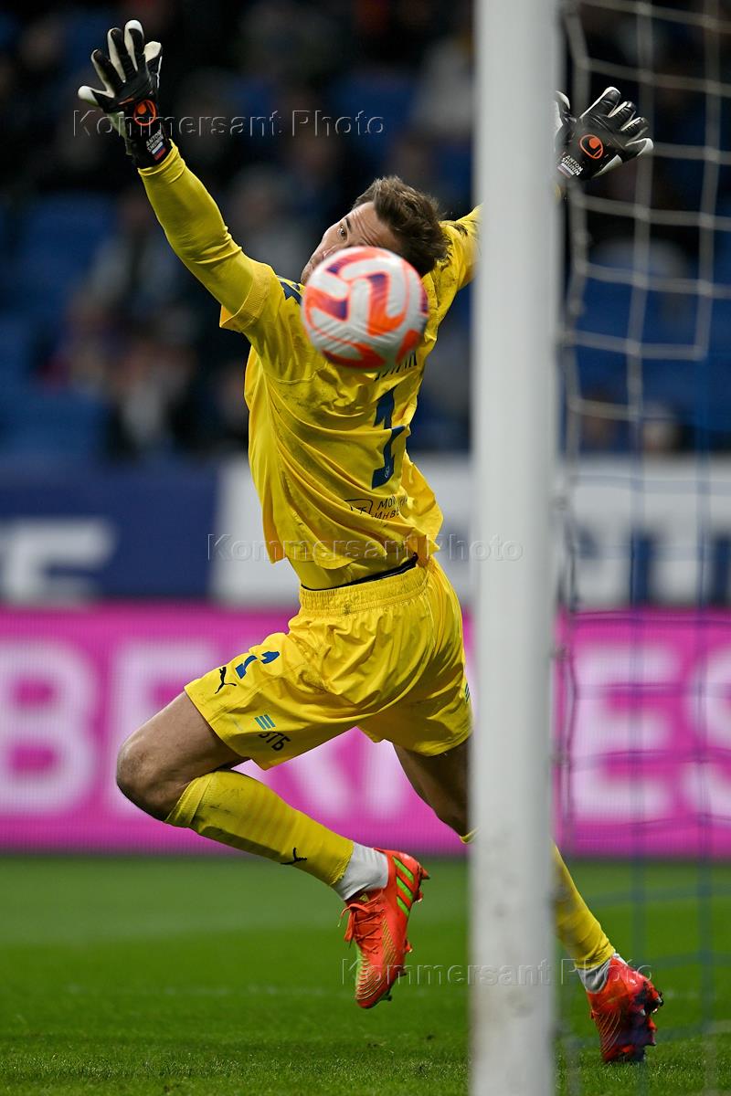 Российская Премьер-Лига (РПЛ). МИР - Чемпионат России по футболу 2022/2023. 13-й тур. Матч между командами "Динамо" (Москва) - "Оренбург" (Оренбург) на стадионе "ВТБ Арена". Вратарь команды "Динамо" Антон Шунин во время матча.