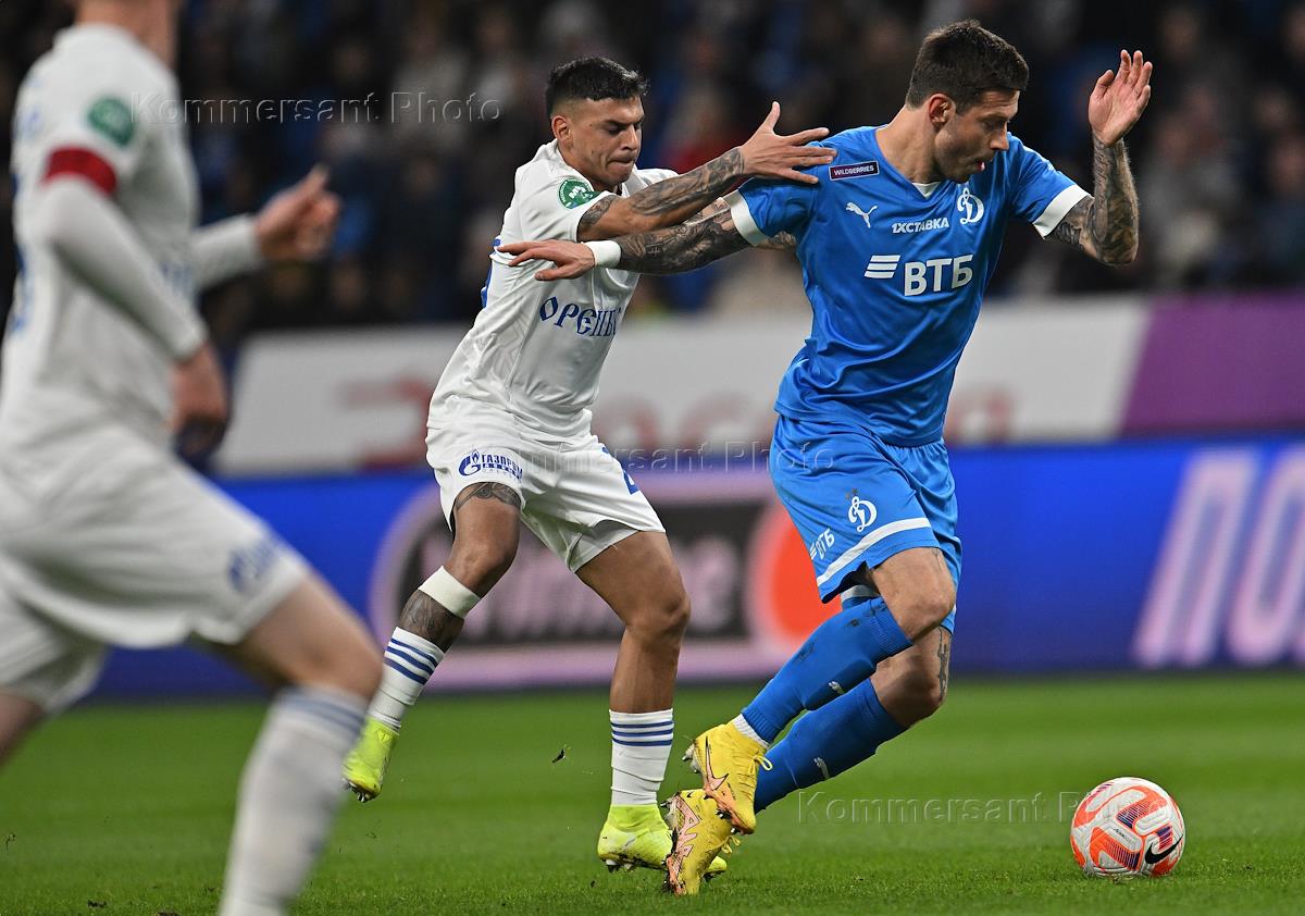 Russian Premier League (RPL). MIR - Russian Football Championship 2022/2023. 13th round. Match between the teams "Dynamo" (Moscow) - "Orenburg" (Orenburg) at the stadium "VTB Arena". Dynamo team player Fyodor Smolov (right) and Orenburg team player Lucas Vera (center) during the match.
