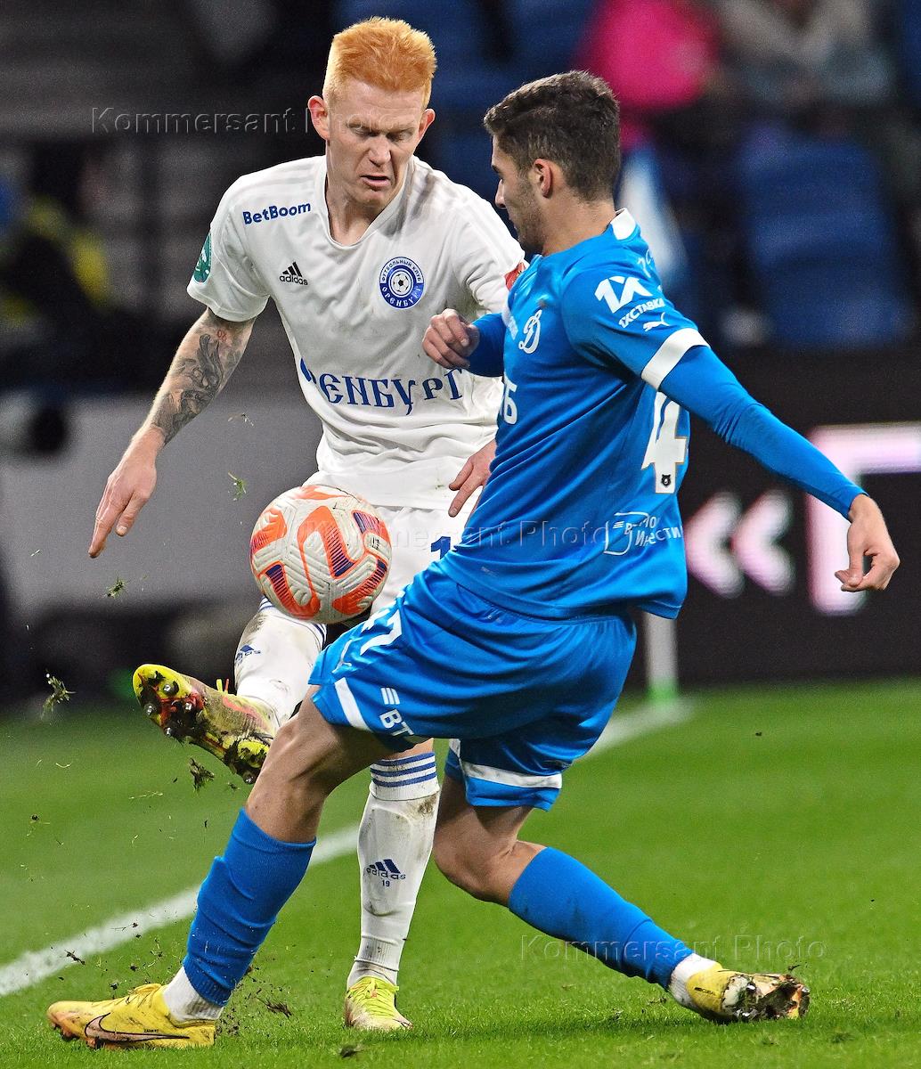 Российская Премьер-Лига (РПЛ). МИР - Чемпионат России по футболу 2022/2023. 13-й тур. Матч между командами "Динамо" (Москва) - "Оренбург" (Оренбург) на стадионе "ВТБ Арена". Игрок команды "Оренбург" Михаил Сиваков (справа) и игрок команды "Динамо" Арсен Захарян (слева) во время матча.