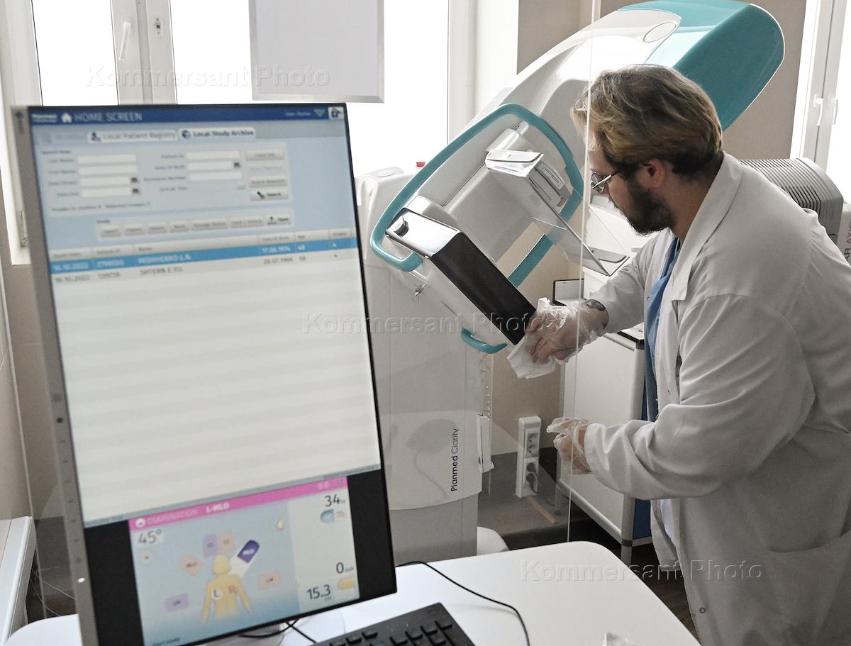 День открытых дверей в рамках месяца борьбы против рака груди в клинике "Семейная". Врач в кабинете маммографии.