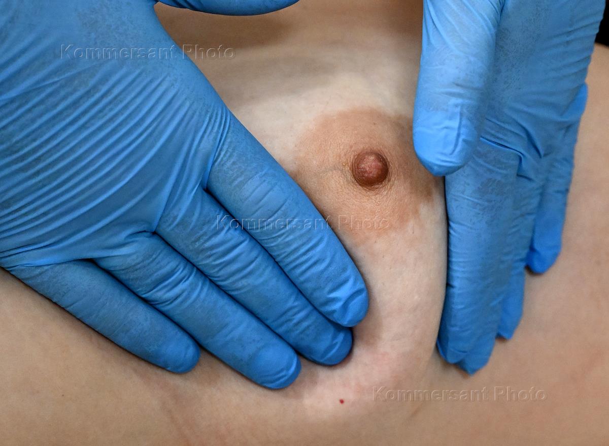 День открытых дверей в рамках месяца борьбы против рака груди в клинике "Семейная". Врач во время ручного осмотра груди пациентки.