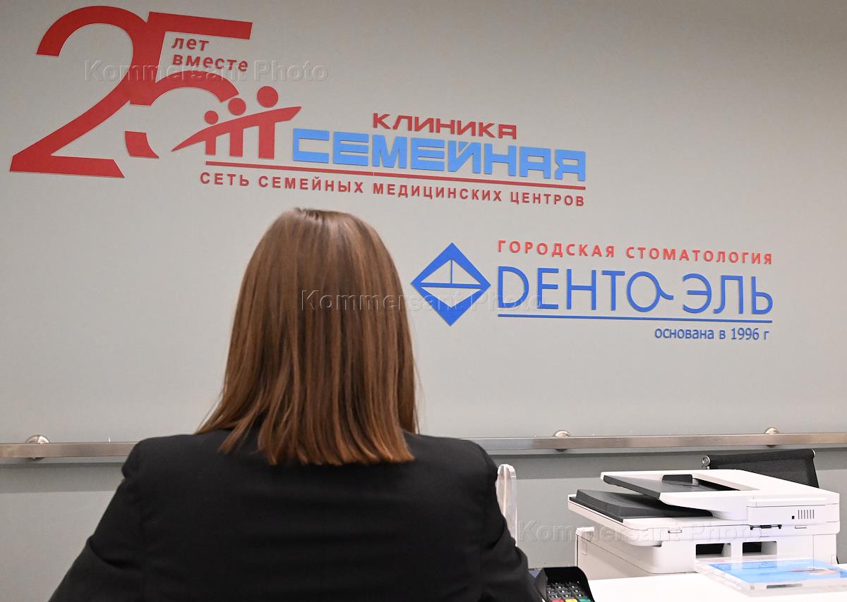День открытых дверей в рамках месяца борьбы против рака груди в клинике "Семейная". Сотрудники регистратуры за стойкой в клинике.