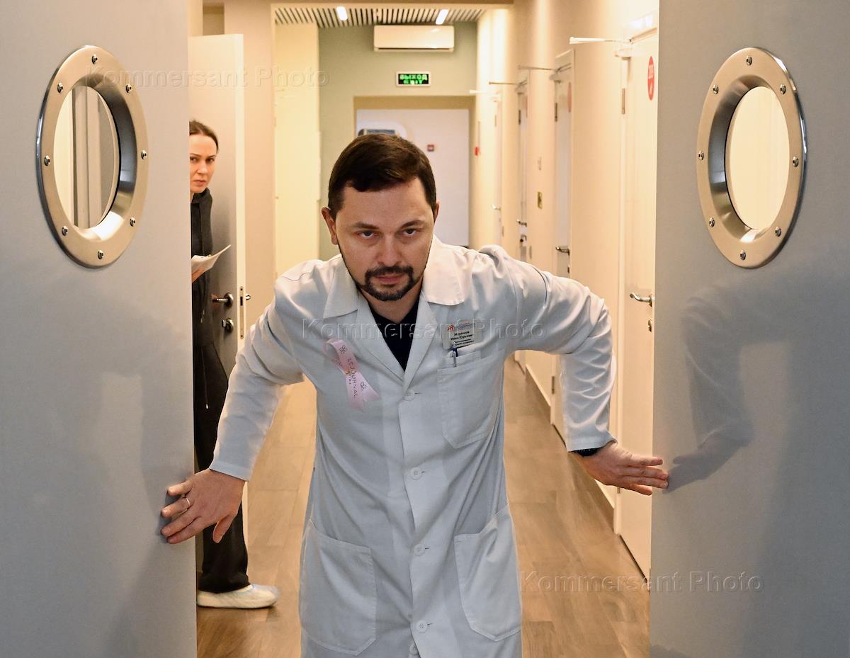 День открытых дверей в рамках месяца борьбы против рака груди в клинике "Семейная". Врач у входа в отделение лучевой диагностики.