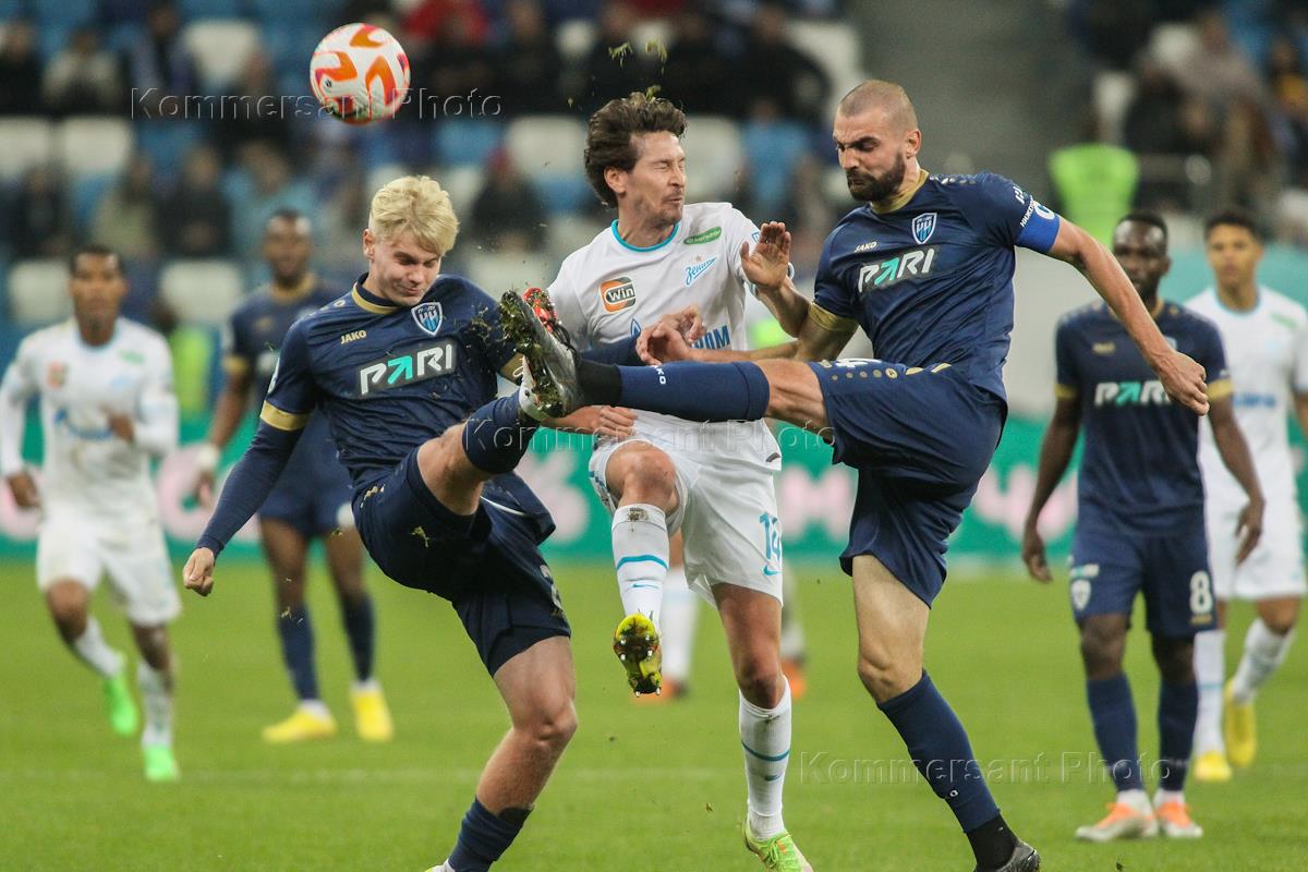 Российская Премьер-Лига (РПЛ). МИР - Чемпионат России по футболу 2022/2023. 13-й тур. Матч между командами "Пари Нижний Новгород (Нижний Новгород) - "Зенит" (Санкт Петербург) на стадионе "Нижний Новгород". Игрок команды "Зенит" Иван Сергеев (в центре) во время матча.
