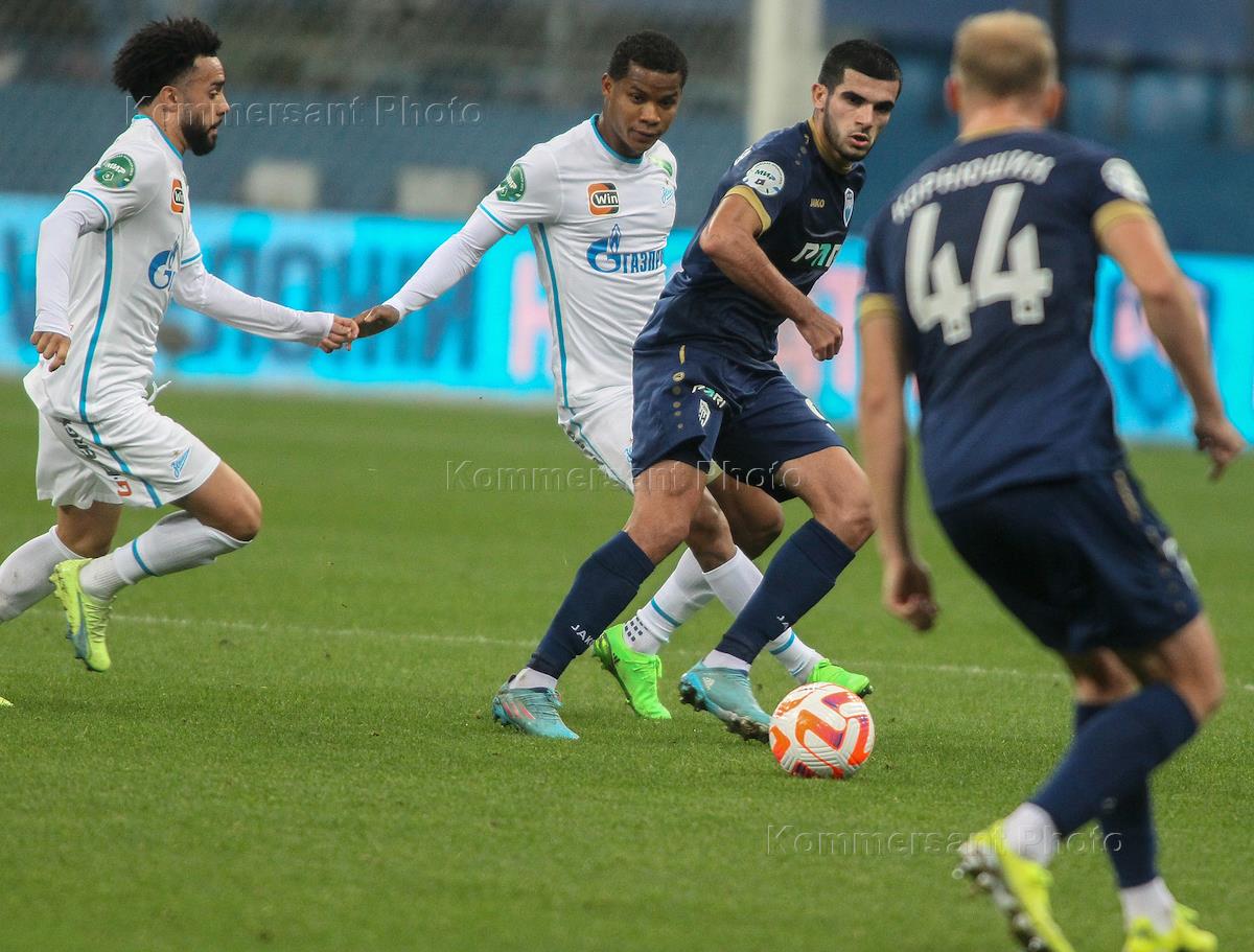 Russian Premier League (RPL). MIR - Russian Football Championship 2022/2023. 13th round. Match between Pari Nizhny Novgorod (Nizhny Novgorod) and Zenit (St. Petersburg) teams at the Nizhny Novgorod stadium. Zenit team player Ivan Sergeyev (center) during the match.