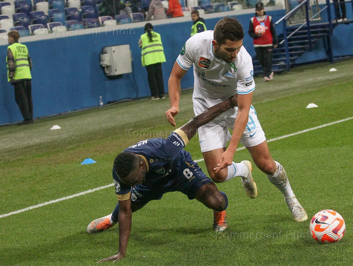 Российская Премьер-Лига (РПЛ). МИР - Чемпионат России по футболу 2022/2023. 13-й тур. Матч между командами "Пари Нижний Новгород (Нижний Новгород) - "Зенит" (Санкт Петербург) на стадионе "Нижний Новгород". Игрок команды "Пари НН" Мамаду Майга (слева) и игрок команды "Зенит" Алексей Сутормин (справа) во время матча.