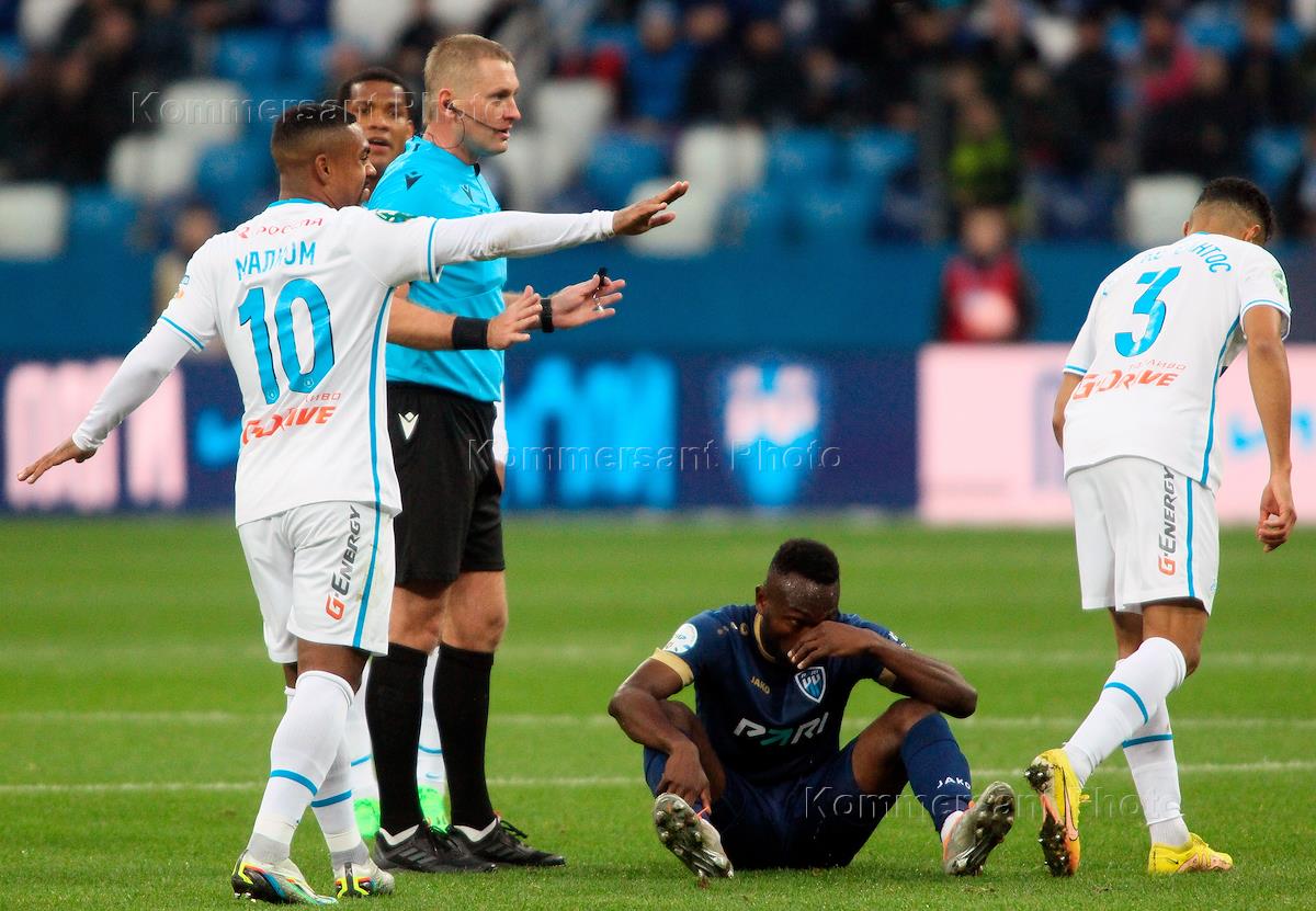 Russian Premier League (RPL). MIR - Russian Football Championship 2022/2023. 13th round. Match between Pari Nizhny Novgorod (Nizhny Novgorod) and Zenit (St. Petersburg) teams at the Nizhny Novgorod stadium. Pari NN team player Mamadou Maiga (left) and Zenit team player Alexei Sutormin (right) during the match.