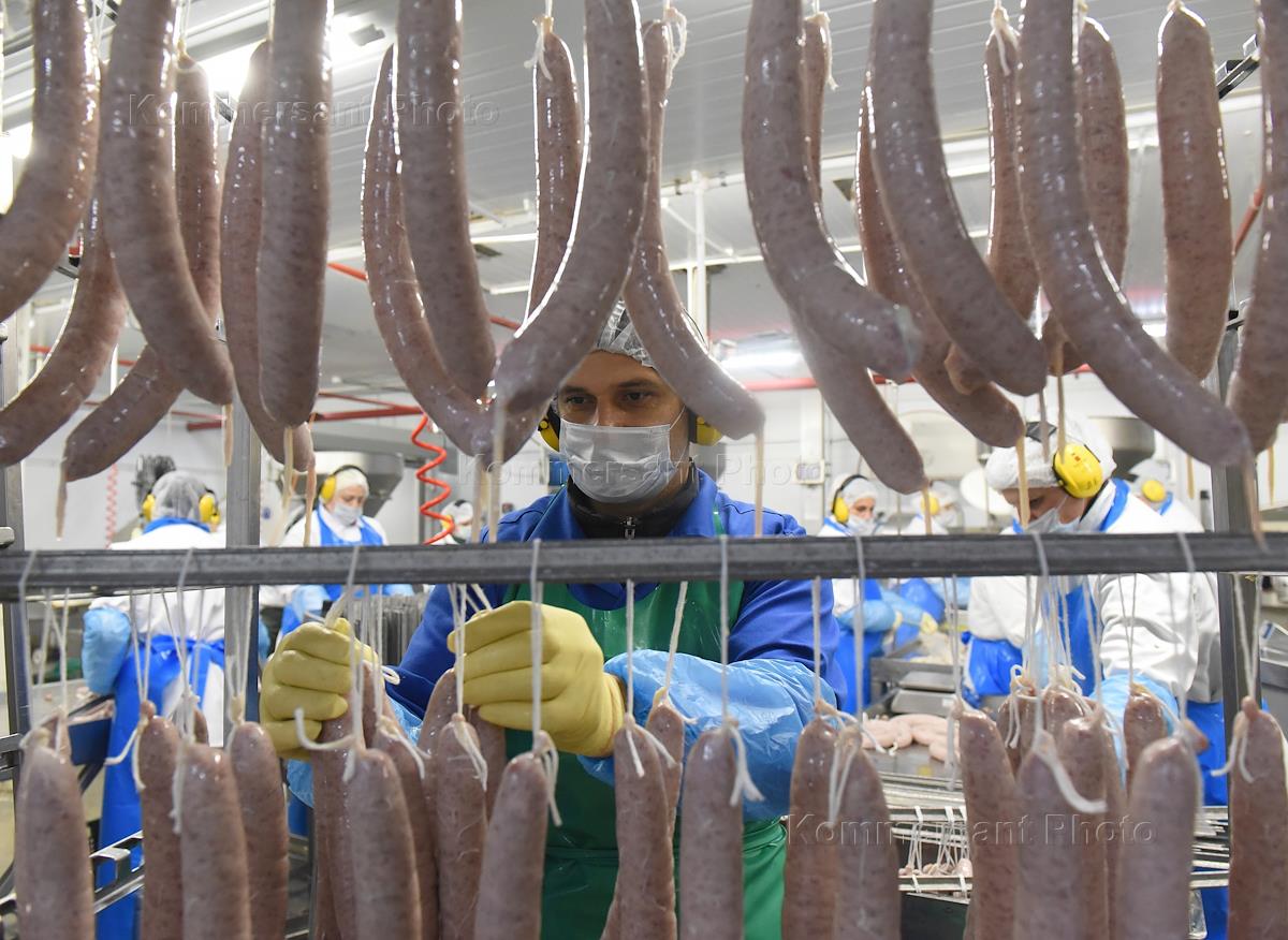 Пресс-тур на мясоперерабатывающий завод компании "Пит-Продукт" (группа "Черкизово"). Сотрудник завода в цехе по производству колбасы.