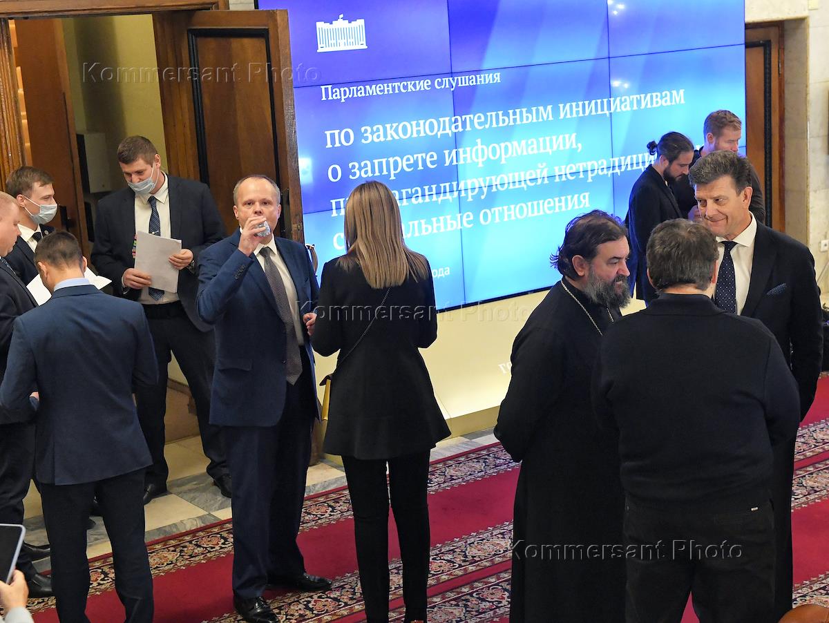 Parliamentary hearings "On the prohibition of propaganda of non-traditional sexual relations" in the State Duma of Russia. Chairman of the Synodal Information Department of the Moscow Patriarchate Vladimir Legoyda (center) before the hearing.