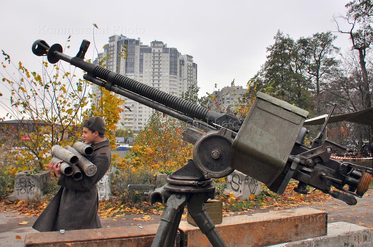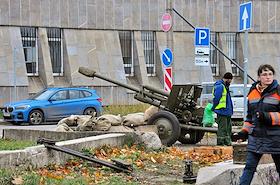 Мероприятие на Васильевском острове, посвященное 81-й годовщине начала блокады Ленинграда в годы Великой Отечественной войны. Артиллеристские пушки на улице города.
