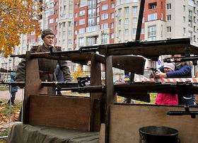 Мероприятие на Васильевском острове, посвященное 81-й годовщине начала блокады Ленинграда в годы Великой Отечественной войны (ВОВ). Мужчина в военной форме времен ВОВ на улице города.