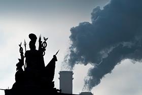 Виды Москвы. Жанровая фотография. Скульптура главного входа в парк "Красная Пресня" на Мантулинской улице на фоне дымящихся труб.